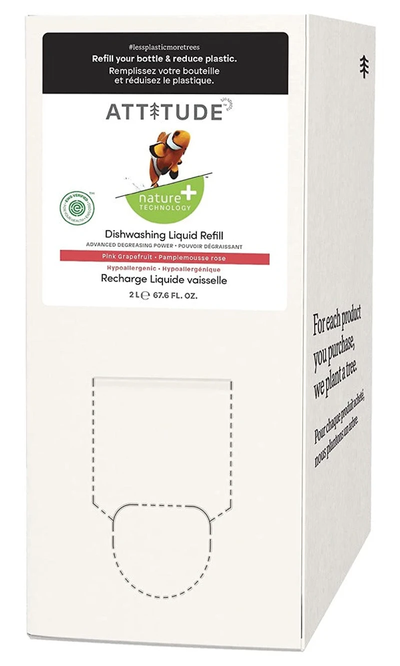 DescriptionAttitude - Dishwashing Liquid Pink Grapefruit - 2 2 L Litres - NPN: 00000000 -- ECO-FRIENDLY LIQUID DISH SOAP REFILL: Our BULK to go container uses 68% less plastic and includes 5 times more product than its bottle counterpart which means less packaging waste!BULK DISH SOAP THAT WORKS: Our effective grease-cutting formula helps remove stubborn food residue from dishes, pots & pans. That means less scrubbing, more free time!PLANT BASED FORMULA: Made of plant based ingredients that meet the highest EWG health standardsHYPOALLERGENIC DISHWASHING LIQUID: Because we care about the most sensitive skins too! Our dish soaps are dermatologically tested, hypoallergenic & non-irritating for your skinVEGAN AND CRUELTY-FREE: PETA Approved, Proudly Vegan & our products are never tested on animals. They are also ECOLOGO Certified: sustainable and biodegradableINGREDIENTS<5% anionic surfactants (coco-glucoside), <5% non-ionic surfactants (lauryl glucoside). Contains also : water, sodium chloride, sodium gluconate, sodium citrate, camellia sinensis (green tea) leaf extract, allyl caproate (sweet fruit), geranyl acetate (herbal), allyl heptaonate (fruit).