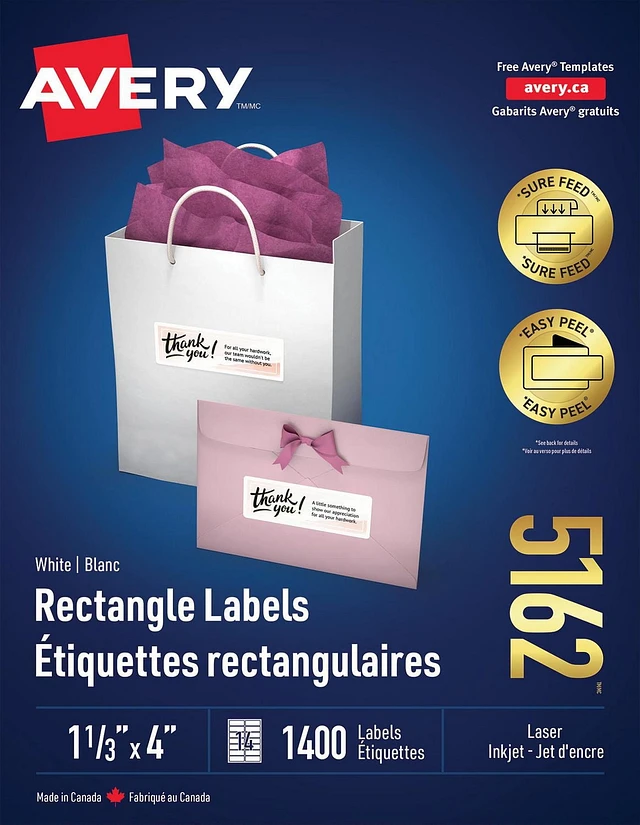 Avery® White Rectangle Labels with Easy Peel® Sure Feed™, 1 ⅓" x 4" for Laser and Inkjet Printers - 5162