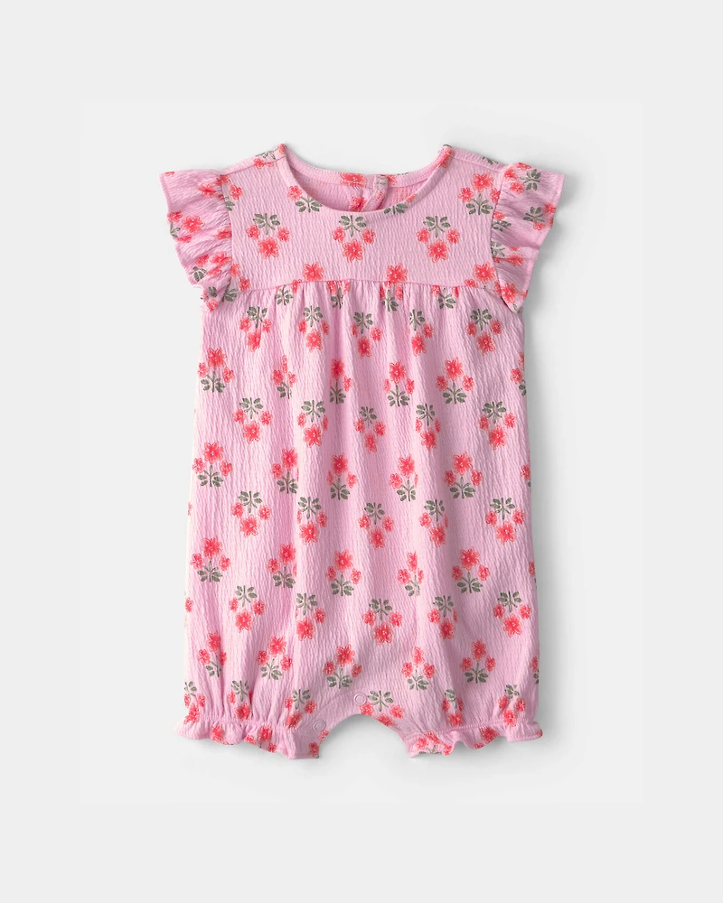 Elevate your little one's wardrobe with this charming floral romper. Designed with ruffle shoulders and a playful pink hue, it offers a delightful blend of style and comfort. The snaps at the crotch ensure effortless diaper changes, while the cut-out back adds a trendy touch. Made from soft jersey fabric, this romper is perfect for warm days and active play. Plus, it meets STANDARD 100 by OEKO-TEX® certification, ensuring safety and quality for your baby. Embrace fashion and functionality with this must-have piece for every season.