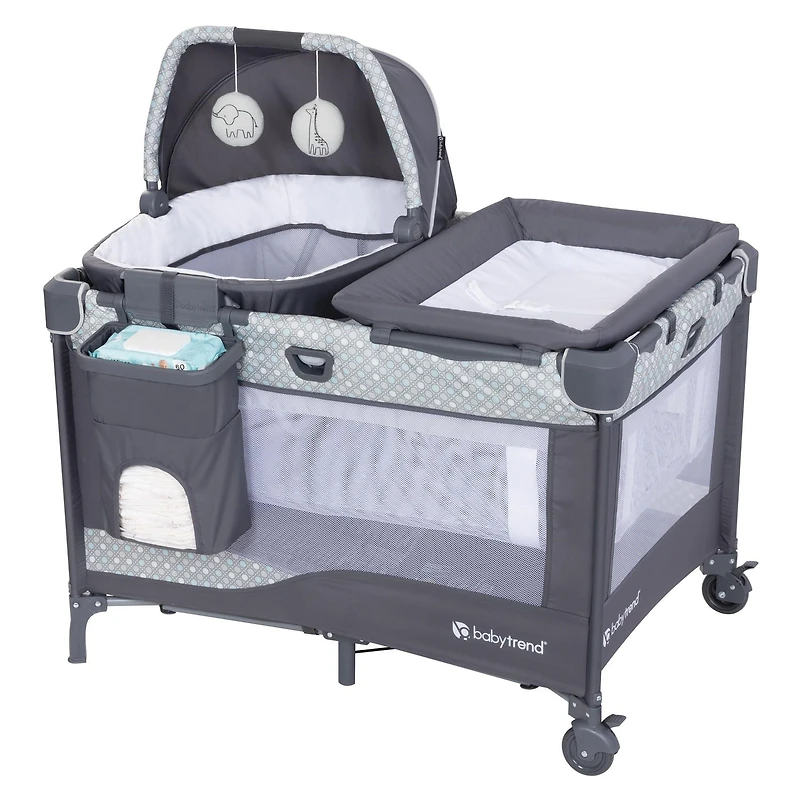 The Baby Trend Nursery Den Playard with Rocking Cradle offers your family various naptime and playtime options as your little one grows! The standalone rocking napper with a canopy and carry handle is the perfect portable option to keep your baby restful even when on the go. Diaper time is a breeze with the flip away changing table and diaper stacker for changing essentials. The removable full-size bassinet transforms into a convenient play time center as your child grows. The integrated Fold-Assist Technology includes a fold assisting mechanism for effortless set-up and takedown of the playard frame. The soft tire wheels with brakes provide added mobility and stability wherever your Nursery Den may go. The compact fold easily fits into the included tote bag for easy travel.