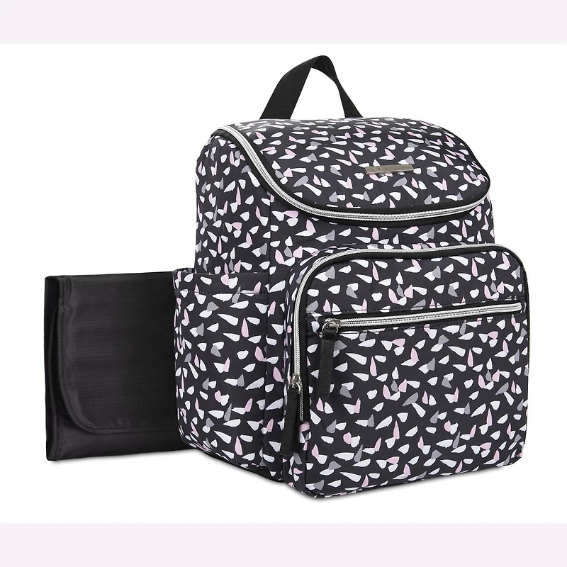 Bananafish Studio Front Zippered Compartment Everley Backpack Diaper Bag - Black with Allover White, Grey & Pink Print