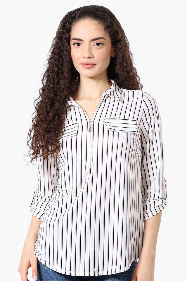 Beechers Brook Striped Roll Up Sleeve Half Zip Blouse - White
