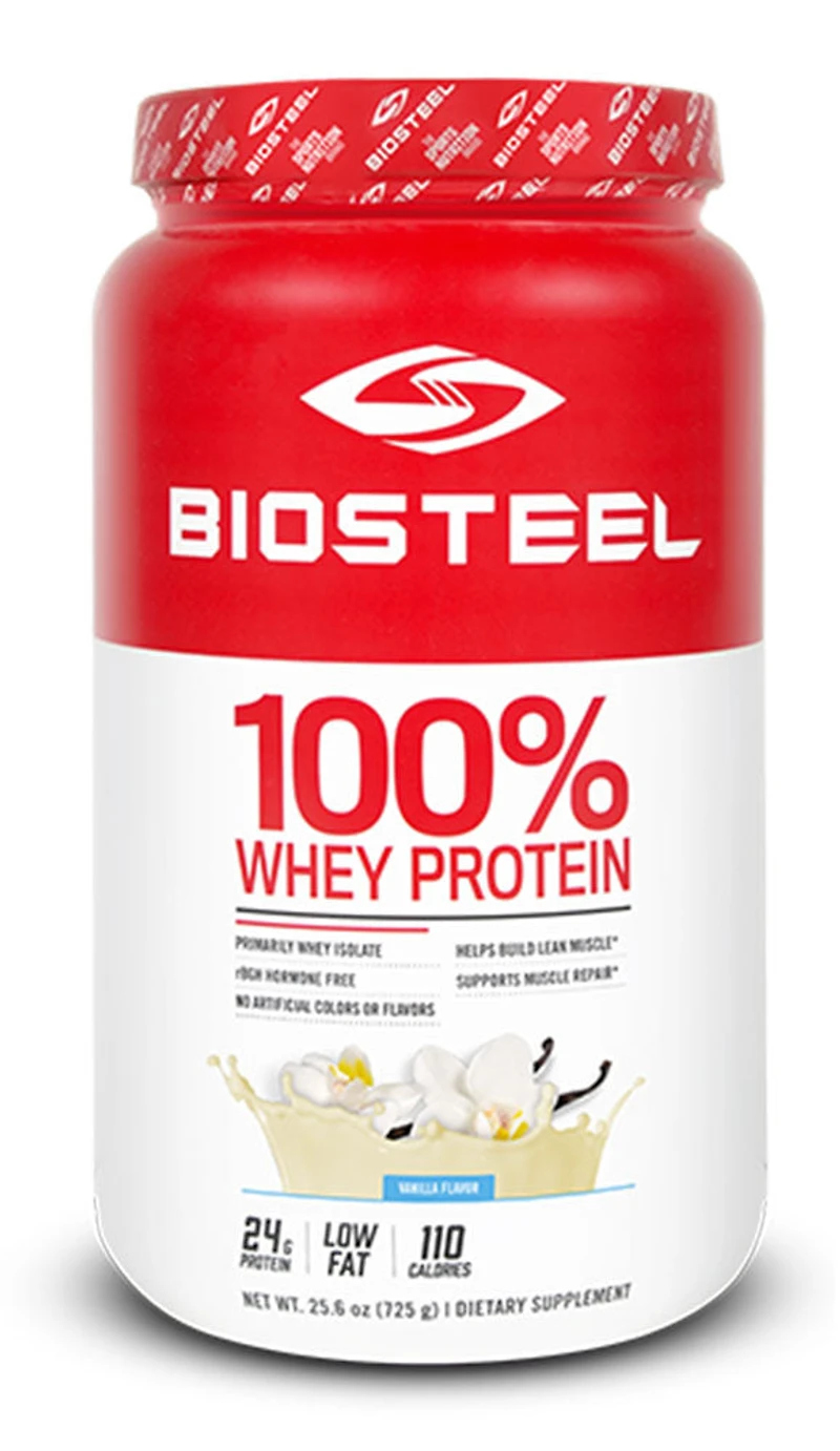 DescriptionBIOSTEEL - Natural 100% Whey Protein Blend - 725 725 gr Grams - NPN: 00000000 -- Perfect For Delivering Essential Proteins To Your Body After A Workout, BiosteelS Whey Protein Blend Provides A Blend Of Three High Quality Protein Sources That Are Easily Absorbed And Digested By The Body With Optimum Nutritional Benefits. Natural, Non-Gmo Ingredients Premium Blend Of 3 Proteins: Whey Protein Isolate, Whey Protein Concentrate, And Whey Protein Hydrolysate No Gluten, Soy, Antibiotics, Or Hormones Sugar Free - Sweetened With Stevia Assists In Muscle Development And DigestionPERFECT FOR DELIVERING ESSENTIAL PROTEINS TO YOUR BODY AFTER A WORKOUT, BIOSTEELS WHEY PROTEIN BLEND PROVIDES A BLEND OF THREE HIGH QUALITY PROTEIN SOURCES THAT ARE EASILY ABSORBED AND DIGESTED BY THE BODY WITH OPTIMUM NUTRITIONAL BENEFITS.INGREDIENTSAMOUNT PER SERVING % DAILY VALUE Calories 110 Fat 1 g 2% Saturated 0.5 3% (+) Trans 0 g Cholesterol 30 mg Sodium 90 mg 3% Potassium 190 mg 6% Carbohydrate 3 g 1% Fibre 1 g 2% Sugars 1 g Protein 24 g Calcium 110 mg 10% Iron 1 mg 4% Amino Acids Profile per serving L-Alanine 1227 mg, L-Arginine 548 mg, L-Aspartic Acid 2583 mg, L-Glutamic Acid 3787 mg, L-Glycine 432 mg, L-Histidine 312 mg, L-Isoleucine 1494 mg, L-Leucine 2364 mg, L-Lysine 2134 mg, L-Methionine 509 mg, L-Phenylalanine 682 mg, L-Proline 1468 mg, L-Serine 1182 mg, L-Threonine 1758 mg, L-Tryptophan 284 mg, L-Tyrosine 613 mg, L-Valine 1354 mg NON-MEDICINAL INGREDIENTS Chocolate: Cocoa Powder, Natural Flavour, Guar Gum, Salt, Stevia, Lecithin (Emulsifier). Vanilla: Natural Flavour, Guar Gum, Salt, Stevia, Lecithin (Emulsifier).