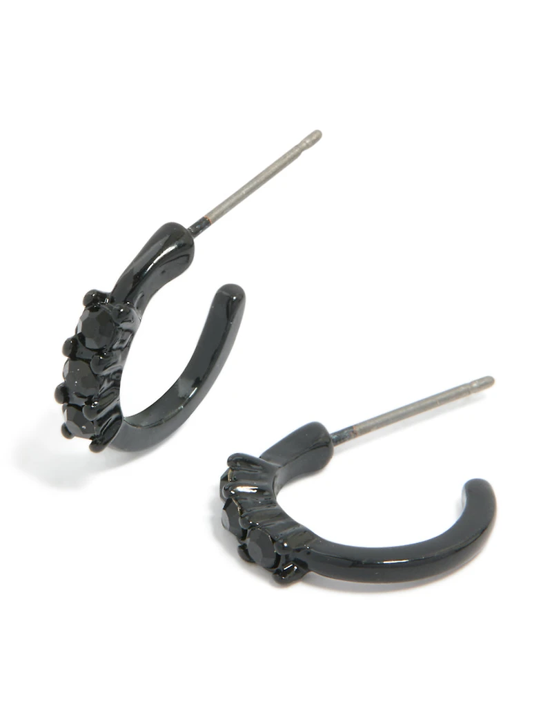 Turn up the edge with these Black Coated Metal Triple Diamante Huggie Earrings. This bold pair of huggie earrings wraps snugly around the ear, giving you that hoop earring look with a sleek, black coated metal finish and triple row of shimmering diamante details. Perfect for nights out, gigs or weekend brunch, these earrings style effortlessly with a leather jacket, a little black dress or your favourite jeans and tee. Wear them solo for a clean, modern vibe or stack with other ear piercings for a cool, curated ear look. Colour: Black Dimensions: Length 14 mm x Width 2 mm