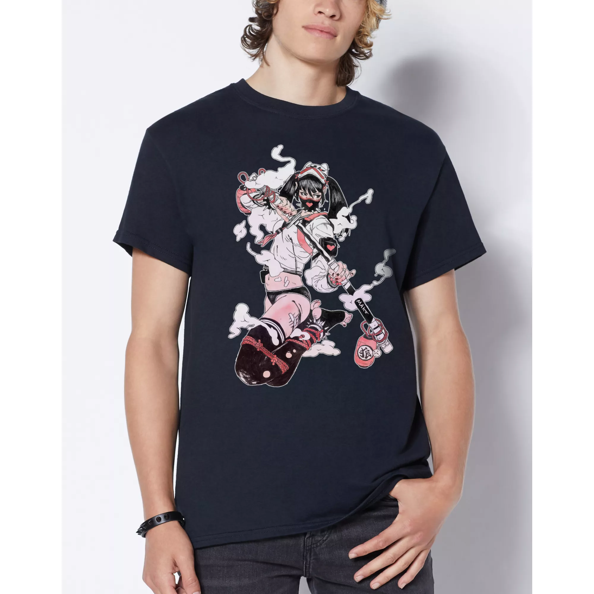 Add an edge to your t shirt collection with this action-packed t shirt by Mako. Featuring a mysterious, katana-wielding beauty, this manga-inspired t shirt bleeds creativity.
