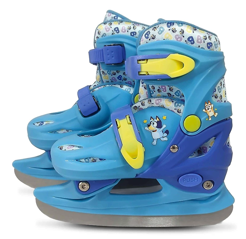 Step into these Bluey Ice skates and glide into the winter season in style! Enjoy those cold winter days ice skating in style with these Bluey ice skates. These skates have power buckles and a tool free adjustability to ensure a comfortable snug fit. Inner boot has padded comfortable liner to keep feet warm. With a cool two tone blue, pop of yellow and patterned inner boot design, these Bluey ice skates will have your child looking and feeling great while they glide on ice with Bluey and Bingo along for the ride! These skates are a great option for beginners.