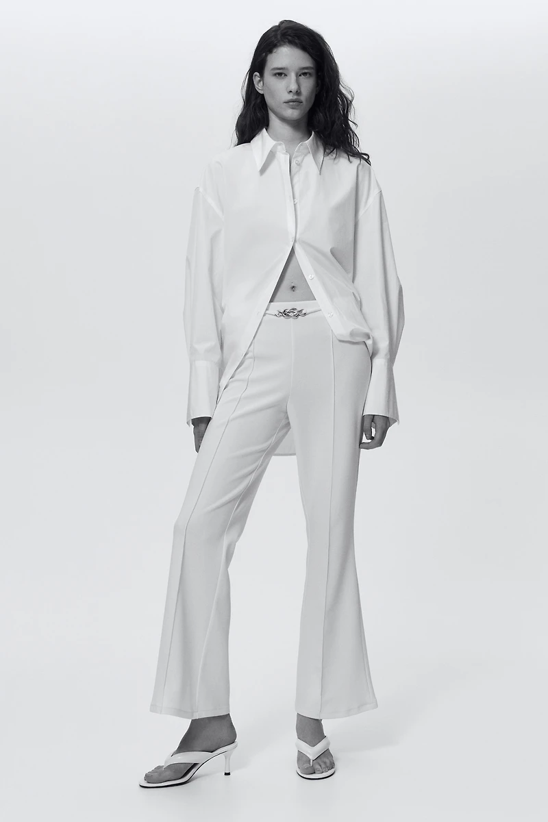 Dress pants in thick ponte jersey with stitched creases at front and back. High waist, elasticized waistband, and a decorative belt with metal buckle at front. Bootcut legs.