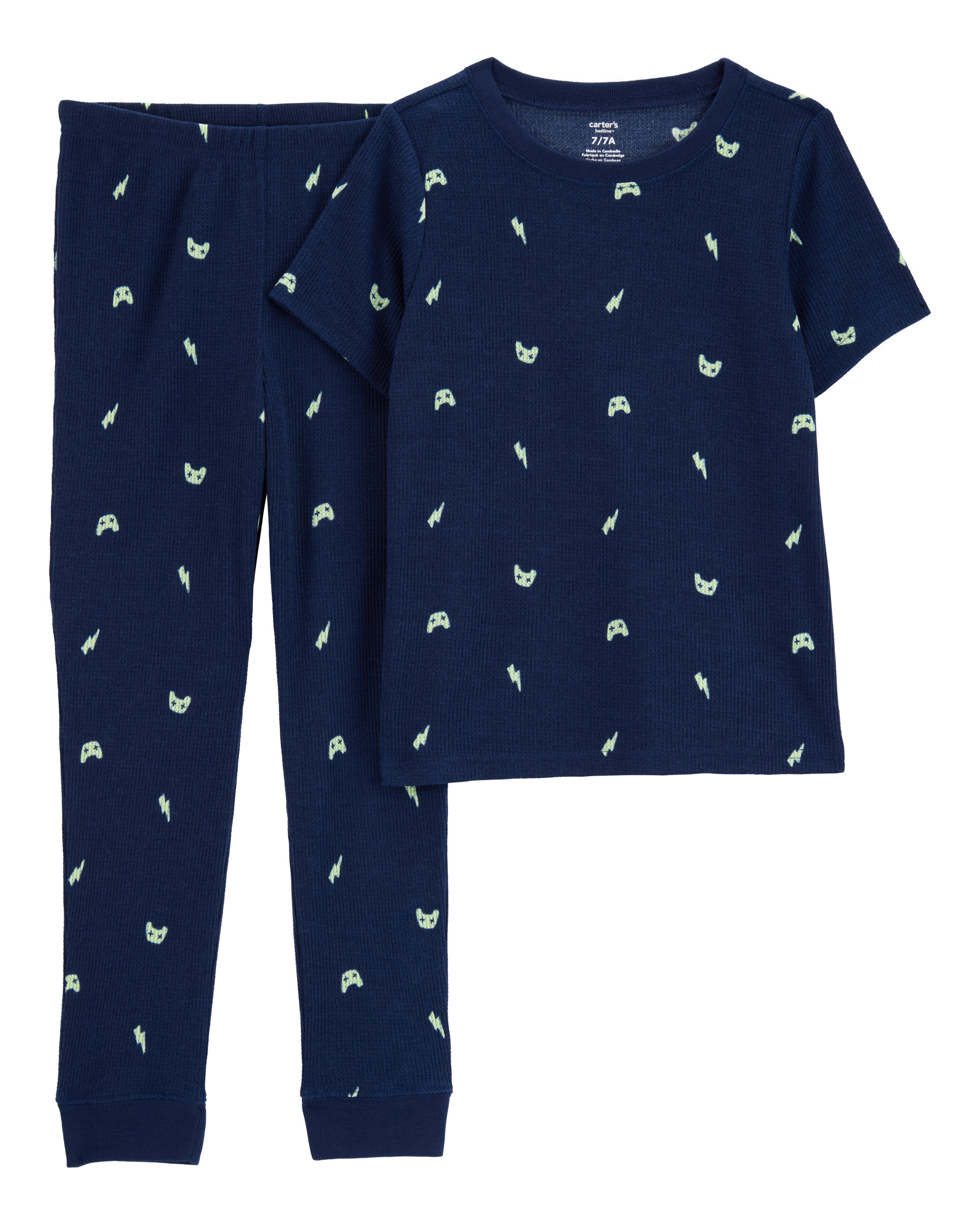 Boys Gamer Print Loose Fit Waffle Knit 2-Piece Pyjamas - Navy