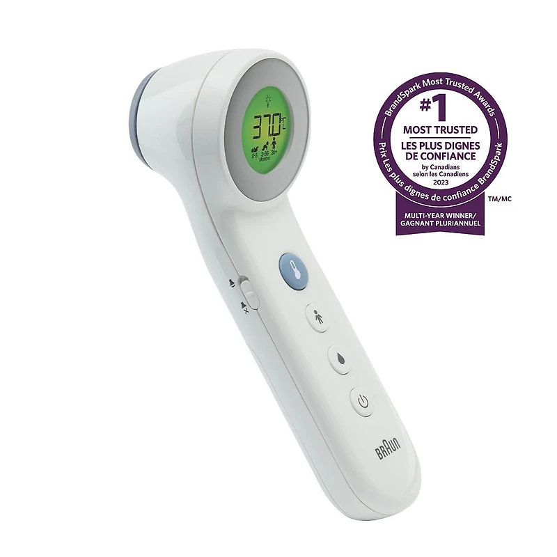 #1 Brand used by Pediatricians* and most trusted by parents.The Braun BNT400CA No touch + forehead thermometer gives you accurate readings instantly. The first-ever thermometer with the convenience of two clinically proven options to take a temperature – completely non-invasive no touch or traditional forehead touch. Also good for use on a sleeping child.Clinical research shows the definition of fever changes as newborns grow into children and children grow into adults***Based on a US survey reporting that of the surveyed pediatricians (1) who recommend a brand of thermometers, Braun is the most recommended; and (2) who use a branded thermometer, Braun is the most frequently used.**Herzog L., Phillips S. Addressing Concerns About Fever. Clinical Pediatrics. 2011; 50(#5): 383-390.***Voted most trusted Children’s Thermometer brand by Canadian shoppers based on the BrandSpark® Canadian Trust Study, years 2017 to 2022.Click “From the manufacturer” below for more information about product features and how-to-use videos.
