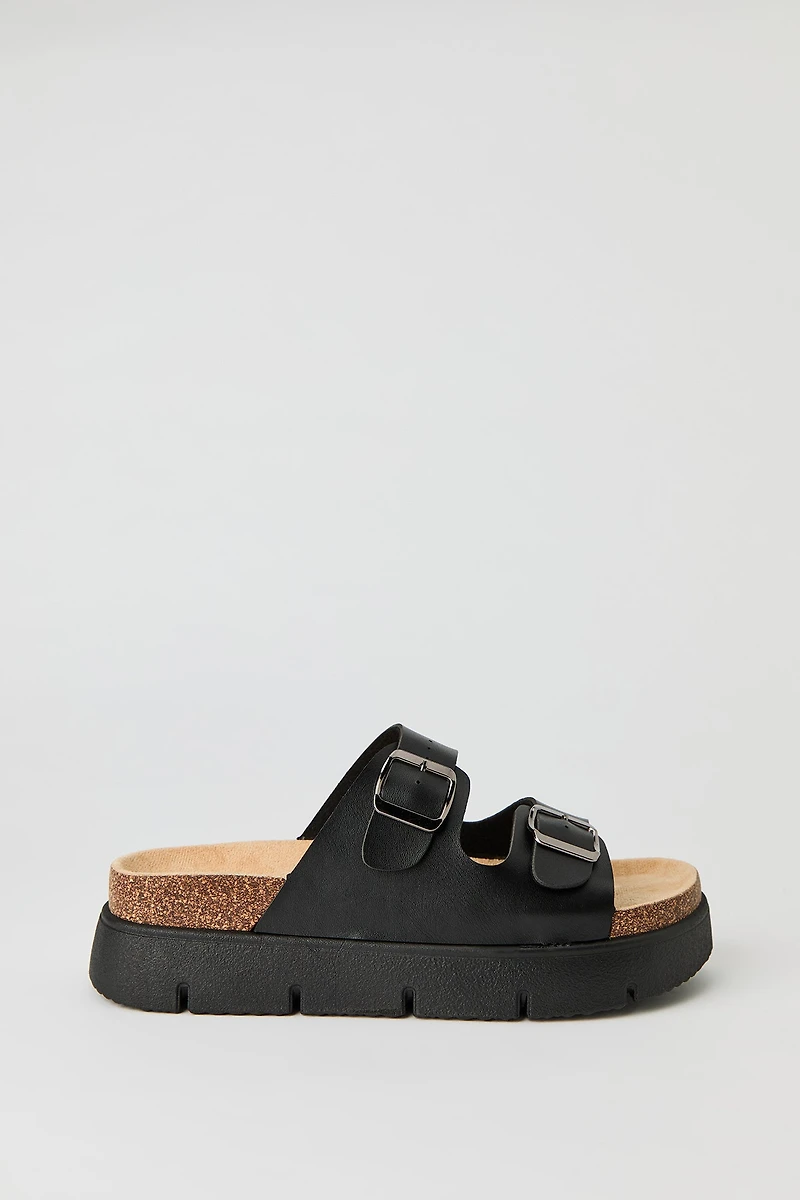 This sandal features faux-leather/cork material, adjustable buckle straps, chunky sole, and slip-on design. Imported