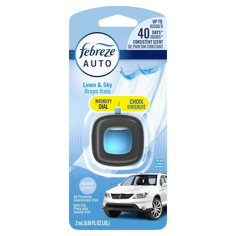 - Doesn't just mask, fights odors;Febreze CAR fights odors and slowly releases a light, fresh scent for up to 30 days* *On low and under ambient conditions;Attaches easily to car vent and allows you to select the level of intensity to control how much freshness is released;Bring the outdoors inside with the fresh-off-the-clothesline scent of Febreze Linen & Sky Scent;We do not use phthalates, formaldehyde or flammable propellants as ingredients when we make Febreze