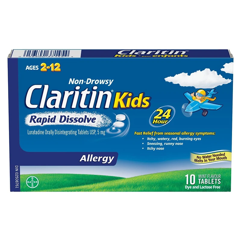 An allergy is an exaggerated reaction of your child’s immune system to otherwise harmless substances, like those from tree, grass or weed pollens. When your kid comes into contact with these allergen sources, their body confuses them with a harmful substance and attacks them by releasing histamine into the body, which causes allergy symptoms in kids.When your child is struggling with allergy symptoms you want to provide them with fast and effective relief so they can go back to enjoying their favourite activities. Claritin Kids Rapid Dissolve allergy pills provide 24 hours of relief from seasonal allergies caused by tree, grass and ragweed pollen, and whether they're at home or at school, the non-drowsy formula will help your child stay alert and focused so they will be able to go about their day without missing a beat.These allergy tablets contains the antihistamine loratadine (5mg/tablet) which provides effective relief from a wide range of allergy symptoms including itchy, watery, red, burning eyes, sneezing, runny nose, and itchy nose. These childrens allergy medicine tablets are convenient, easy to take, and are suitable for children ages 2 and up. Tired of dealing with messy liquid allergy syrups? There's no measuring cup required with Claritin Kids Allergy tablets! The tablets melt instantly in your childs mouth and can be taken without water for all day allergy symptom relief on the go.When it comes to your child's health, you want to make sure that you're giving them a product designed with kids needs in mind. That's why our allergy tablets are made with quality ingredients and are free from dyes, alcohol, and lactose.Don't let allergy symptoms hold your child back, try Claritin Kids Rapid Dissolve today and provide your child with the relief they need to feel better and get back to enjoying life to the fullest.To be sure this product is right for you, always ready and follow the label.