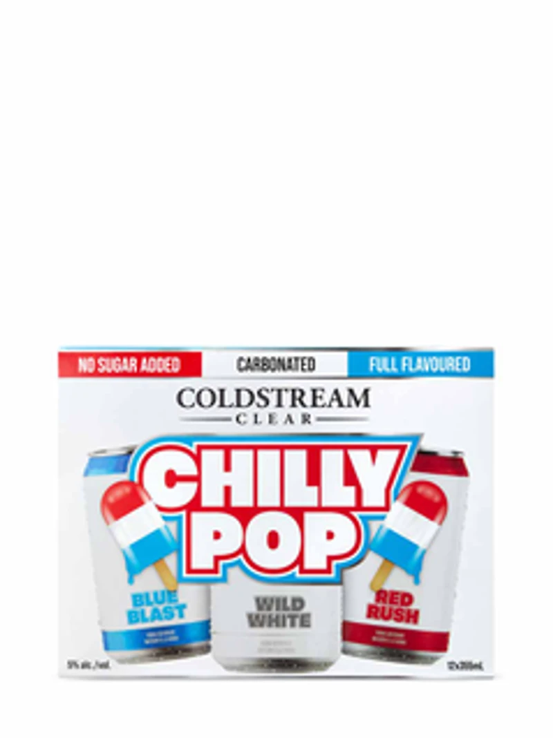 Chilly Pops deliver classic ice pop flavours with a refreshing fizzy kick, no sugar, and only 99 calories per 355mL can. This convenient mixer pack features four cans of each of three flavours: Blue Blast bolds blue raspberry flavour, Wild White's classic white popsicle flavour and Red Rush's vibrant, juicy cherry flavour. Chilly Pops deliver classic ice pop flavours with a refreshing fizzy kick, no sugar, and only 99 calories per 355mL can. This convenient mixer pack features four cans of each of three flavours: Blue Blast bolds blue raspberry flavour, Wild White's classic white popsicle flavour and Red Rush's vibrant, juicy cherry flavour. 12 x 355 mL can