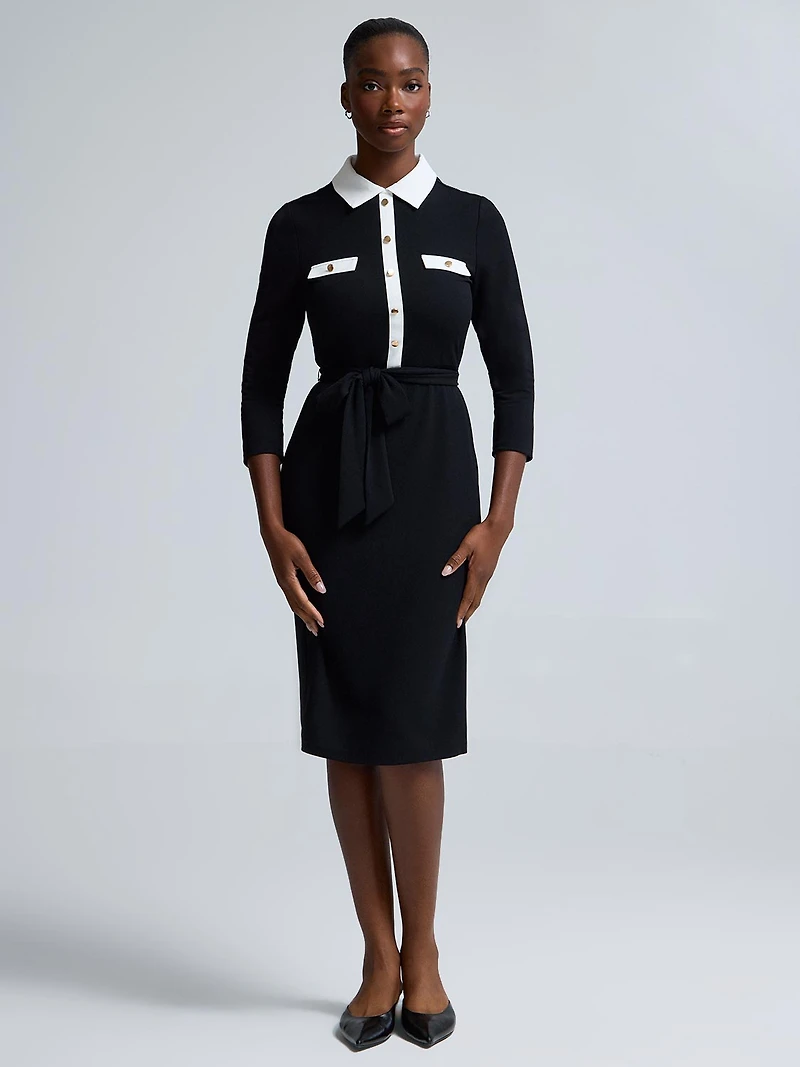 A contrasting collar and placket adorn this shirt dress, giving the black dress a standout feature that elevates the classic design.