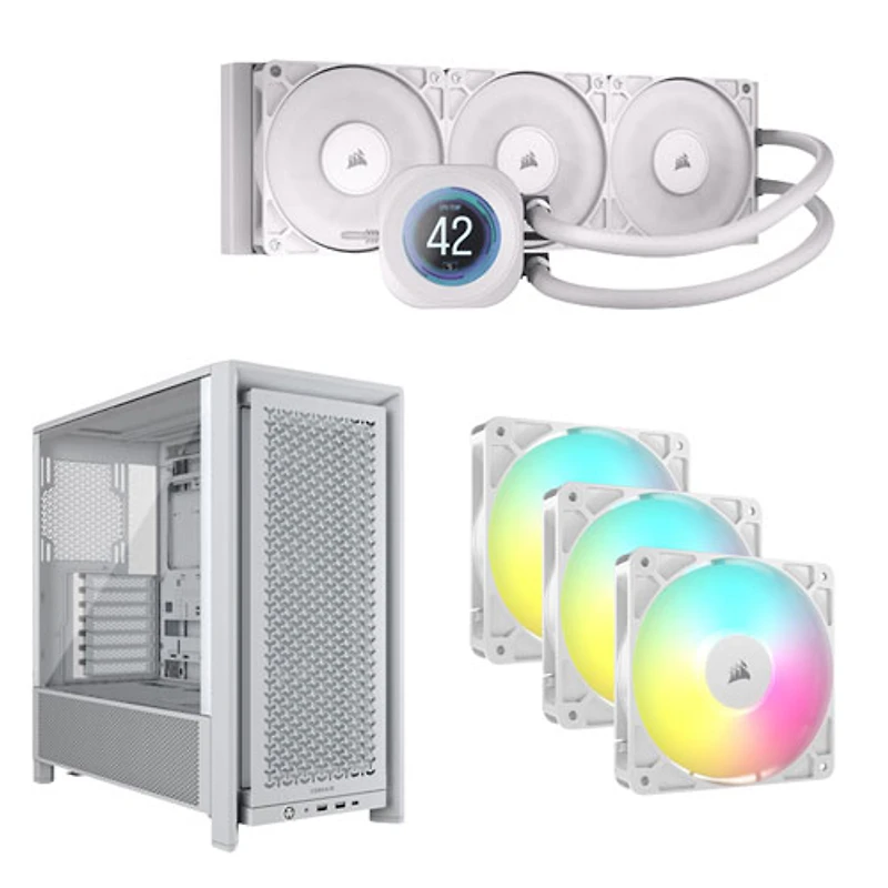 Optimize your CPU’s performance with the Corsair Nautilus 360 RS LCD liquid cooling system, Corsair RS120 ARGB PWM triple case fan kit, and Corsair Frame 4000D ATX computer case bundle.