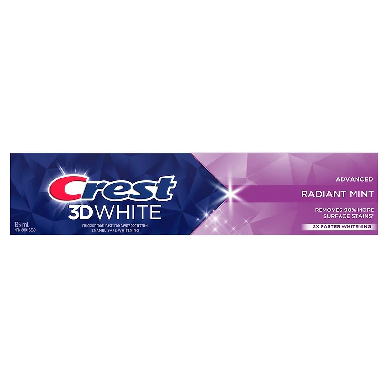 Brighten your smile with Crest 3D White Advanced Radiant Mint Whitening Toothpaste. This Crest toothpaste removes 90% more surface stains*, protects against future stains, and starts whitening your teeth after 1 brush. This 3D White toothpaste also strengthens your tooth enamel and helps protect teeth against cavities. It. leaves your smile with a bright and minty- fresh feeling. *Vs. regular toothpaste.