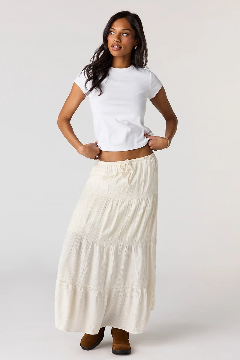 This skirt features crinkled material, drawstring waist, tiered construction, and maxi length.
