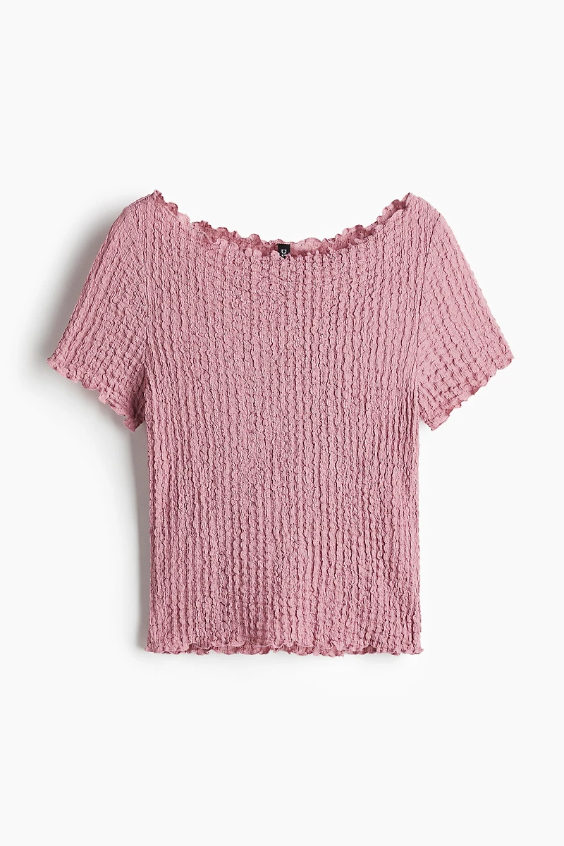 Short, fitted top in crinkled jersey with overlocked edges. Delicate boat neck and short sleeves.