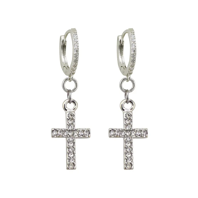 CZ Silvertone Titanium Cross Dangle Huggie Hoop Earrings