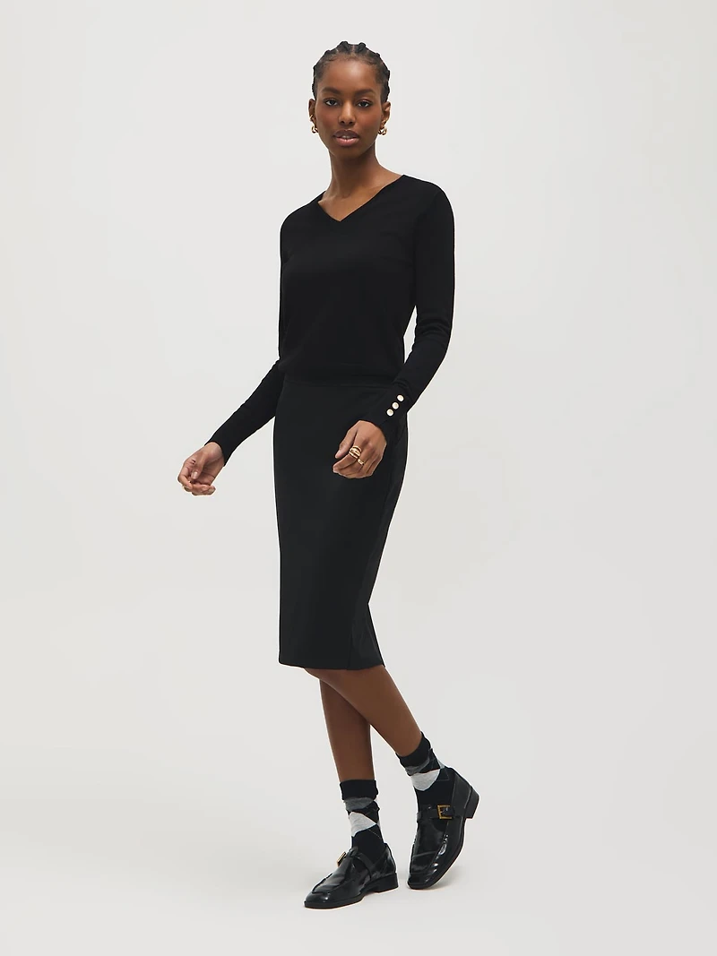 Tailored, refined, and ready for the workday, this double-face pencil skirt hugs the body with a clean and structured silhouette. Designed with a back slit and stretch fabric, you can ensure sophisticated style and comfort from morning meetings to after-work plans. Knit pencil skirt Double faced knit Back zip Side elastic Center back slit Back yoke Unlined Model is wearing size S Fabric: 78% nylon, 22% spandex Bonded fabric: 95% polyester, 5% spandex Machine wash inside out in cold water Hang to dry