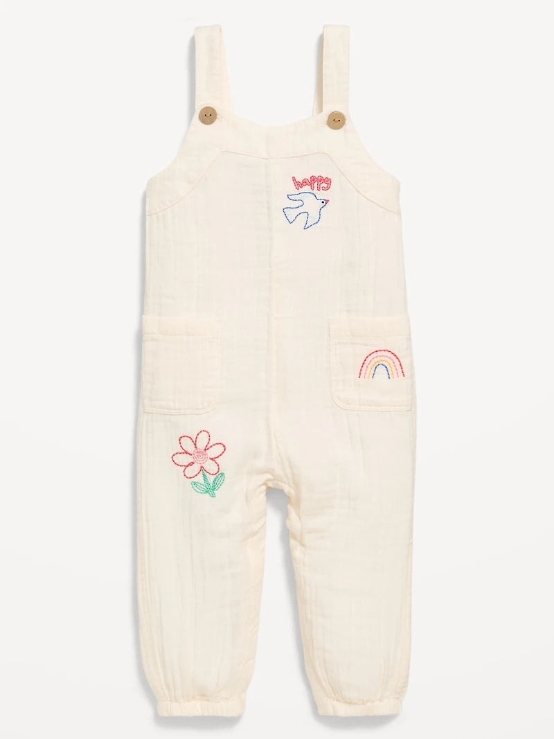 square neckline shoulder straps side pockets hidden snaps along inseam embroidered graphics relaxed fitmachine wash according to the care instruction label .