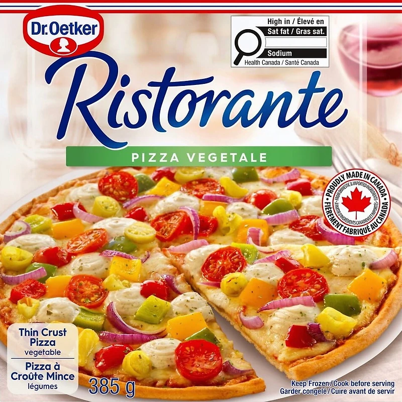 Experience passion on your palate with Ristorante! Thin & crispy Italian-style pizza. Dr. Oetker Ristorante Vegetale thin crust pizza is topped with helpings of tangy tomatoes, mouth-watering peppers, onions and pickled chilies over our tomato signature pizzeria style sauce. Enjoy delicious pizza moments with Dr Oetker! • Tomatoes, Peppers, Onions, Pickled Chillies, Mozzarella and Edam • Cook Time: 13-14 minutes • Made in Canada from domestic and imported ingredientsCooking Instructions:1. Preheat oven to 425 °F (220 °C).2. Remove pizza from all packaging.3. Place frozen pizza directly on the middle oven rack. Bake 13-14 min and until cheese is melted and crust is golden brown.CAUTION: Pizza will be very hot