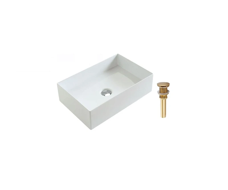 Upscale your bathroom with this DROP vessel sink set; designed to be installed as above counter vessel and standard drain. The vessel sink features a rectangular shape. It is constructed with ceramic and brass. This vessel sink set comes with a gloss finish vessel sink in white color and a gold color drain. This modern vessel sink product is CUPC certified. Drain is included. Faucet is NOT included.