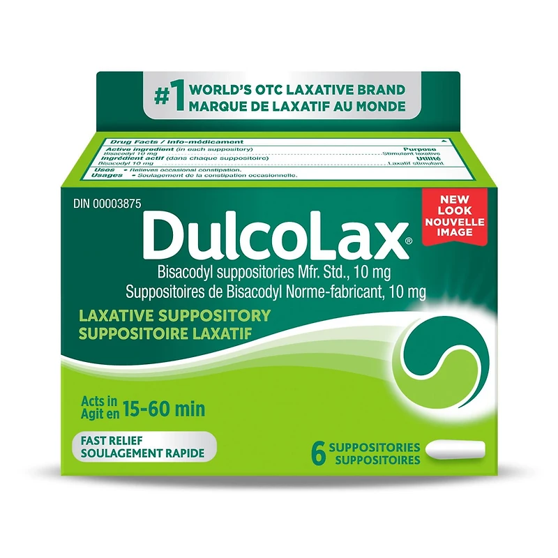 Dulcolax Laxative Suppositories are there for you when you need quick, dependable relief from occasional constipation. Dulcolax suppositories come in a 6-count package, with each suppository containing 10 mg of bisacodyl. Bisacodyl acts to stimulate the bowel and helps retain water in the intestines which softens stools so they pass more quickly. Dulcolax works with your body to activate your gut for a predictable overnight relief. Suitable for adults and children 12 and older, as well as for breastfeeding women, the laxative suppositories provide effective, occasional constipation relief in as little as 15 minutes to one hour. Trusted for more than 60 years, Dulcolax is there when you need fast occasional constipation relief. To ensure this product is right for you, always read and follow the label.