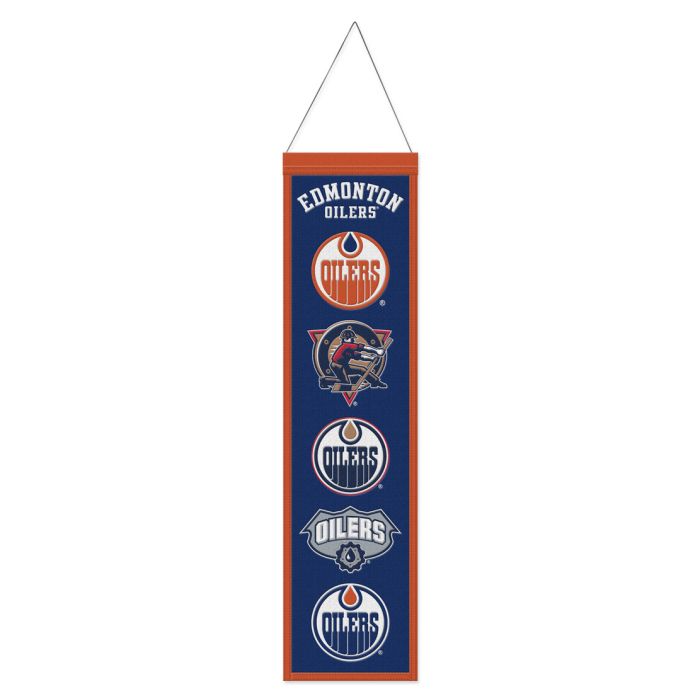 Celebrating the memories of years gone by, our Evolution banners capture the visual evolution of official logos and marks. Hang this banner to show off your Edmonton Oilers spirit. This authentic piece of sports memorabilia is perfect for office, home or fan cave decor, and is a great gift idea, too.8" wide x 32" high100% Wool Blend FeltConstructed with high quality embroidery and applique detailDesigned with the teams' logos throughout the team's historyIncludes a hanging cord for easy displayIron safe backing to keep banner in pristine conditionOfficially Licensed.