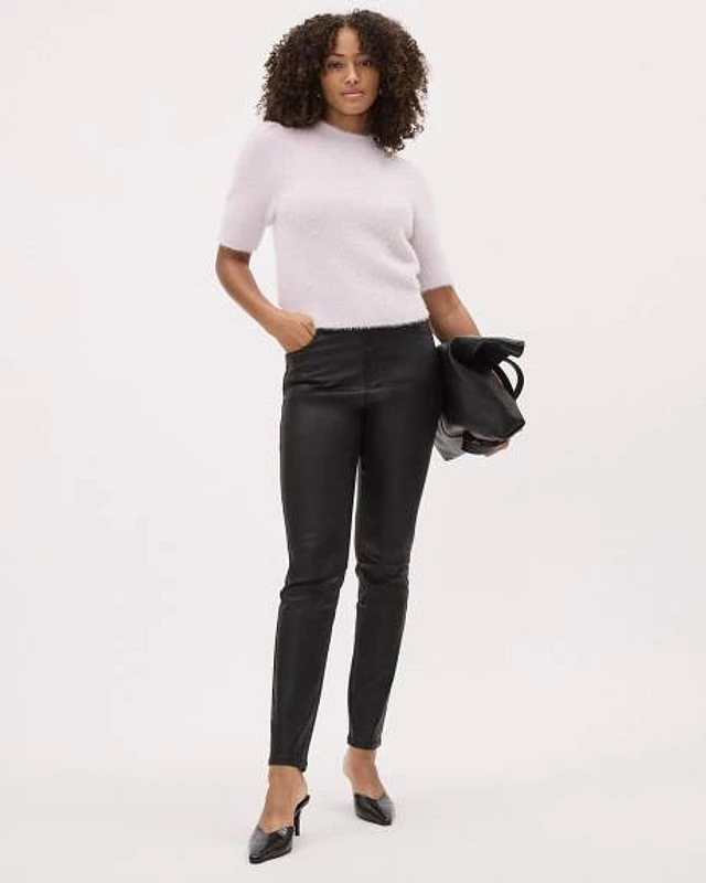 Elbow-Sleeve Mock-Neck Feather-Yarn Pullover with Pearls