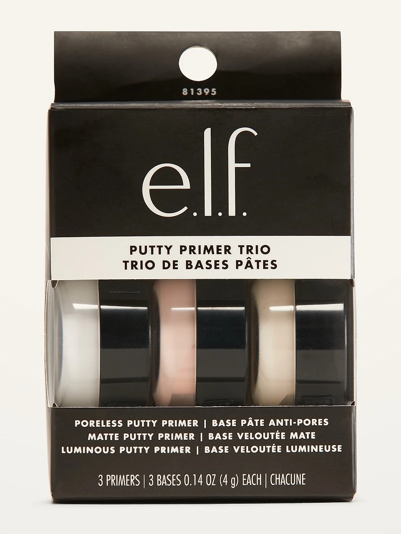 Set Includes: Poreless Putty Primer – Perfect for those who want a poreless, flawless finish. Matte Putty Primer – Perfect for those who want a shine-free matte finish. Luminous Putty Primer – Perfect for those who want a radiant, glowing finish. Creates the perfect, flawless complexion with or without makeup. Infused with skin-loving ingredients, Squalane and Hyaluronic Acid. Perfect size for travel. DIRECTIONS: Using e. l. f. 's Putty Primer Applicator, apply a thin, even amount to moisturized skin prior to makeup application. Allow to set for 30 seconds before applying foundation. Pro Tip: To create a perfect canvas, use all 3 putty primers. Apply Poreless Putty Primer on areas that contain pores like around your nose and cheeks for a flawless look. Apply Luminous Putty Primer on the top of your cheekbones for a glowing complexion. Apply Matte Putty Primer on your t-zone for a shine-free matte complexion. All e. l. f. products are free from phthalates, parabens, nonylphenol ethoxylates, triclosan, triclocarban, and hydroquinone. All skincare is also free from sulfates. All e. l. f. products are cruelty free and vegan. Net Wt. 0. 14 OZ (4g) each. All copy © e. l. f. Cosmetics.