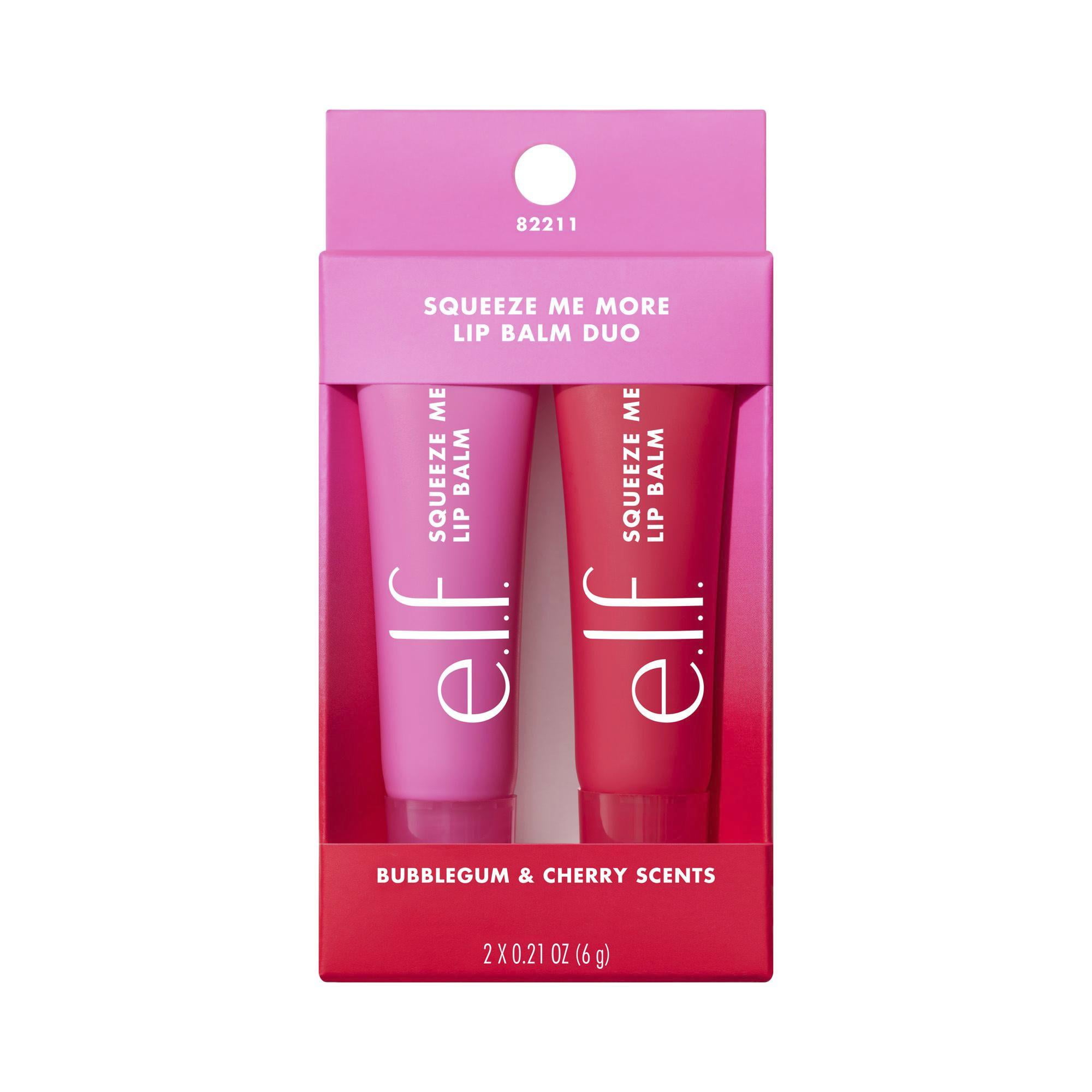 The juiciest e.l.f.ing duo for hydrated lips and a sheer kiss of natural-looking color. e.l.f. Cosmetics’ Squeeze Me More Lip Balm Duo features a pair of fan-fave Squeeze Me Lip Balms in 2 exclusive scents and shades that e.l.f. fans picked—Cherry & Bubblegum! These pocket-sized, lightweight lip balms are perfect for on the go.All e.l.f. products are free from phthalates, parabens, nonylphenol ethoxylates, triclosan, and triclocarban.e.l.f. is proud to partner with Fair Trade USA™ and manufacture products in Fair Trade Certified™ facilities. Look for the Fair Trade Certified™ seal on your e.l.f. product!e.l.f. stands with every eye, lip, face, paw and fin. Proudly vegan, e.l.f. is double-certified cruelty-free by Leaping Bunny & PETA.
