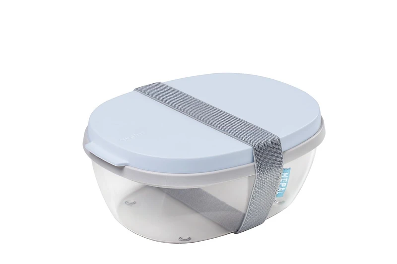 This salad box from Mepal can fit a main meal salad. The transparent box has a transparent lid and is large enough for tossing the salad before eating it. The compartment can be used for carrying bread or cutlery and the small mini box can be used to carry pine nuts or dressings. The salad box Ellipse is indestructible, leak proof and is dishwasher friendly.