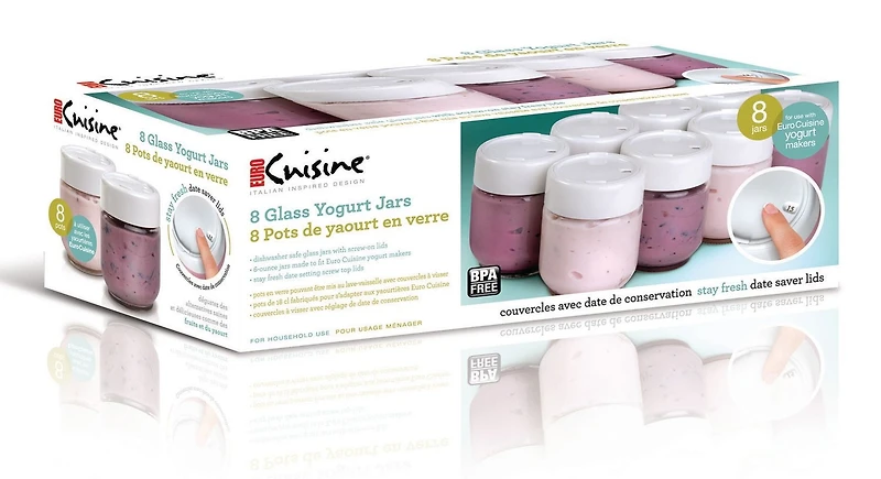 A yogurt lover's essential, the extra set of eight 6-oz. glass jars allows for making up to eight different types of yogurt at one time. No need to finish the first batch before starting another! For use with our Automatic Yogurt Maker, these 6-oz. glass jars feature a freshness dating system that allows you to note the yogurt's made-on date. Because of their clear bodies and ribbed dateable tops, these jars may be stacked, making them space efficient. Simply store yogurt easily while reducing the clutter in your fridge.