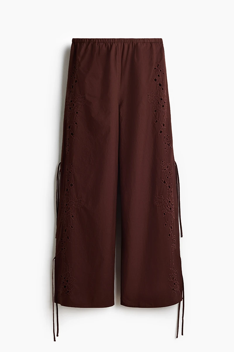 Loose-fit pants in airy woven cotton with eyelet embroidery. High waist, elasticized waistband, and straight legs with an extra-high slit and two pairs of ties at sides.