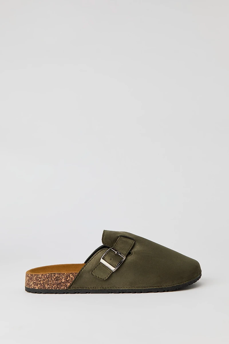 This shoe features faux-suede material, adjustable buckle, cork sole, and slip-on design. Imported