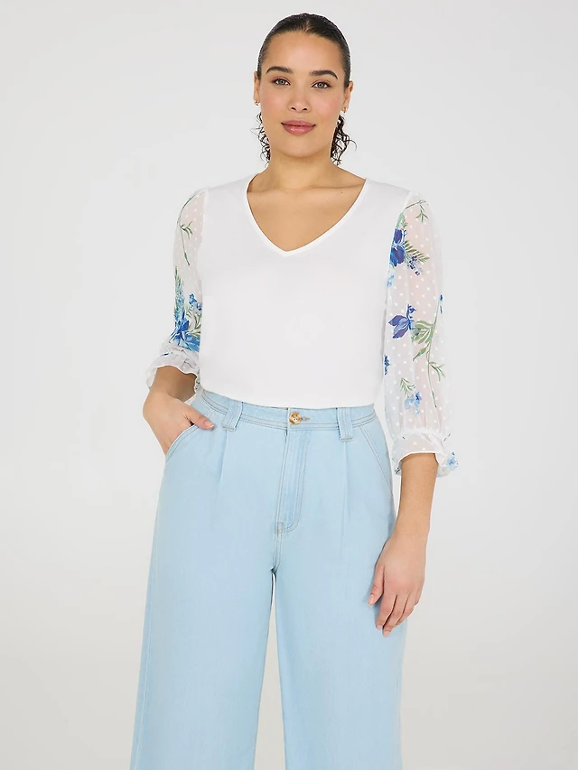 Dot Print Chiffon Sleeve Top & Pull-On Bootcut Jeans