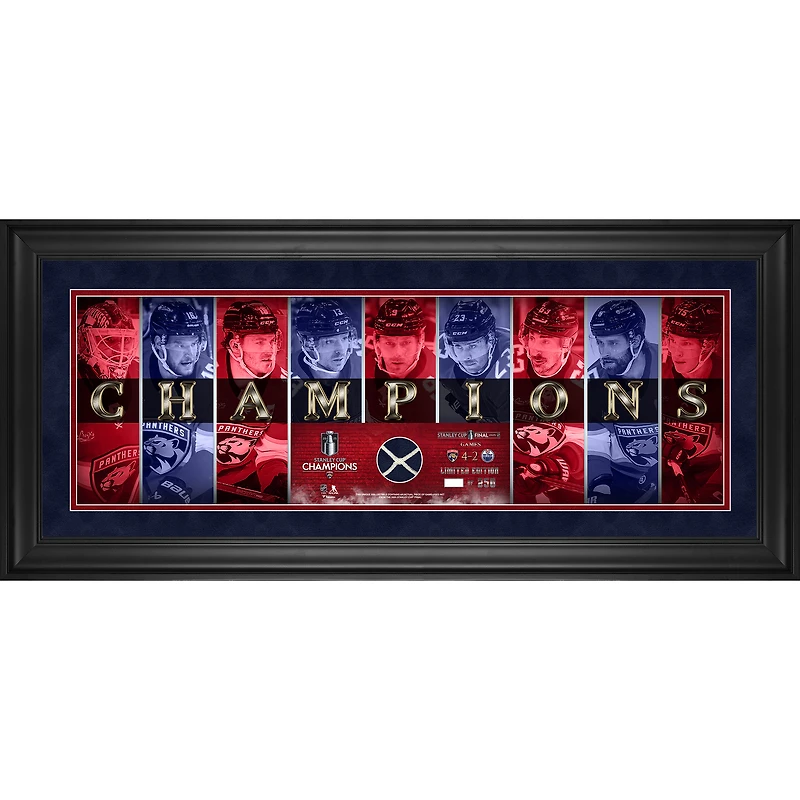 The Florida Panthers fought their way through the best of the best to become the 2025 Stanley Cup Champions. This Framed 10" x 30" Champions Panoramic is the perfect way to celebrate their crowning achievement. Featuring a piece of game-used net from the 2025 Stanley Cup Final, this limited-edition piece's eye-catching graphics let everyone know who stood alone at the top this year.