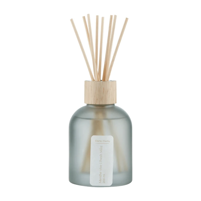 A clean, refreshing blend of cool mint and eucalyptus softened with gentle warmth. This elegant diffuser comes in a 200 ml size, providing a continuous scent experience for up to 16-18 weeks. The sleek glass bottle harmonizes with any décor, while the natural wooden cap adds a touch of warmth. High-quality reeds absorb and release the aroma, creating a soothing ambiance in your home. Packaged in a stylish, eco-friendly tube, this diffuser is an ideal gift or a delightful addition to your own space, ensuring a welcoming atmosphere for all. Fragrance Notes: Top Notes: Mint, Caraway - a crisp, energizing freshness Middle Notes: Vanilla - a smooth, subtle sweetness that perfectly balances the mint Base Notes: Orange - a soft, uplifting citrus finish that keeps the scent light and bright