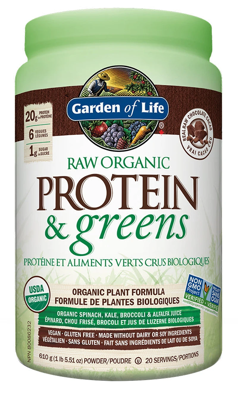 20 grams of plant proteinSix organic greens and veggies100 Calories, 1g of naturally occurring sugar in Chocolate formulaCertified Vegan, NSF Certified, Informed-Choice Certified, USDA Organic, NON-GMO and KosherMade without dairy or soy ingredientsDescriptionGarden of Life - Raw Org. Protein&Greens - Chocolate - 610 610 gr Gram(s) - NPN: 80086232 -- Raw Organic PROTEIN & Greens combines the power of clean organic protein and the nutrient-rich energy of organic greens! It provides a delicious protein boost from organic sprouted brown rice, organic pea & organic chia, plus a blend of nutrient-rich greensa lightly sweet, delicious, CLEAN way to get your protein & greens all at once.INGREDIENTSINGREDIENTS (per scoop): Organic Raw Protein & Greens Blend 26.4g [Organic Pea Protein (Pisum sativum seed, 80% protein, 24.5g), Organic Spinach (Spinacia oleracea leaf, 895.5mg), Organic Sprouted Brown Rice Protein (Oryza sativa seed, 80% protein, 500mg), Organic Chia (Salvia hispanica seed, 30% chia protein, 200mg), Organic Alfalfa Juice (Medicago sativa herb top, 100mg), Organic Broccoli (Brassica oleracea var. italica herb top, 79mg), Organic Sprout Blend 99mg [Organic Navy Bean Sprout (Phaseolus vulgaris, 33mg), Organic Lentil Sprout (Lens culinaris, 33mg), Organic Garbanzo Sprout (Cicer arietinum, 33mg)], Organic Carrot (Daucus carota root, 11mg), Organic Beet (Beta vulgaris root, 10mg), Organic Kale (Brassica oleracea var. viridis leaf, 4.5mg)] Raw Probiotic & Enzyme Blend: Lipase (Aspergillus niger, 1.45 FCC LU), Protease (Aspergillus flavus var. oryzae, 159 FCC HUT), Aspergillus acid protease (Aspergillus niger, 0.857 FCC SAPU), beta-Glucanase (Trichoderma longibrachiatum, 0.190 FCC BGU), Cellulase (Aspergillus niger, 13.8 FCC CU), Bromelain (Ananas comosus var. comosus stem, 4,286 FCC PU), Phytase (Aspergillus niger, 0.381 FCC FTU), Lactase (Aspergillus flavus var. oryzae, 11.4 FCC ALU), Papain (Carica papaya fruit, 5,333 FCC PU), Pectinase (Aspergillus niger, 0.381 Endo-PG), Hemicellulase (Aspergillus niger, 14.3 FCC HCU), Xylanase (Trichoderma longibrachiatum, 3.62 XU), Probiotics 1.5 Billion CFU [Lactobacillus plantarum Lp-115 1.44 billion CFU, Lactobacillus delbrueckii subsp. bulgaricus Lb-87 0.06 billion CFU] Non-Medicinal Ingredients: Raw organic cocoa, organic chocolate flavor, organic tapioca fiber, organic stevia, sea salt, organic sunflower lecithin, organic sunflower oil.