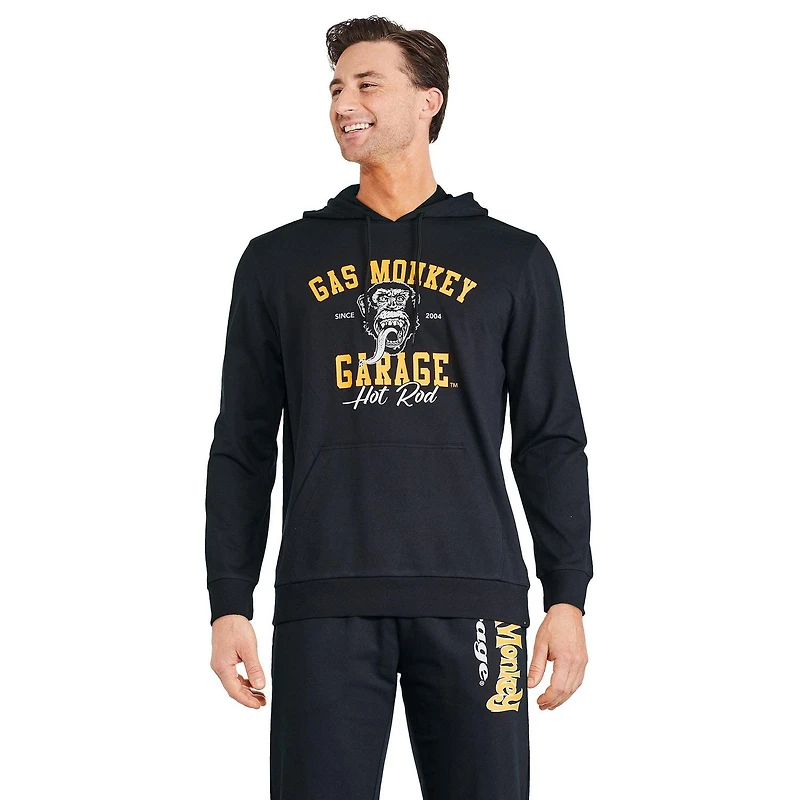 Stay warm and stylish with Gas Monkey Garage men's popover hoodie. Made from cozy French terry, this hoodie features a hood with drawstring, long sleeves, and a front graphic print for added style. The kangaroo pocket is perfect for keeping your essentials on hand, while the ribbed cuffs and bottom band ensure a snug fit. With a straight hem, this hoodie is perfect to pair with matching joggers for a coordinated look.