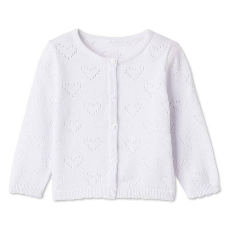 Add a cute and cozy layer to her outfit with George baby girls' cardigan. It’s made of jersey pointelle knit to keep her warm when it’s chilly outside. This cardigan is designed with a crew neck, long sleeves, a full-button closure, and an all-over pattern for a stylish touch. The scalloped ribbed trim at the cuffs and hem adds extra charm to this must-have piece.
