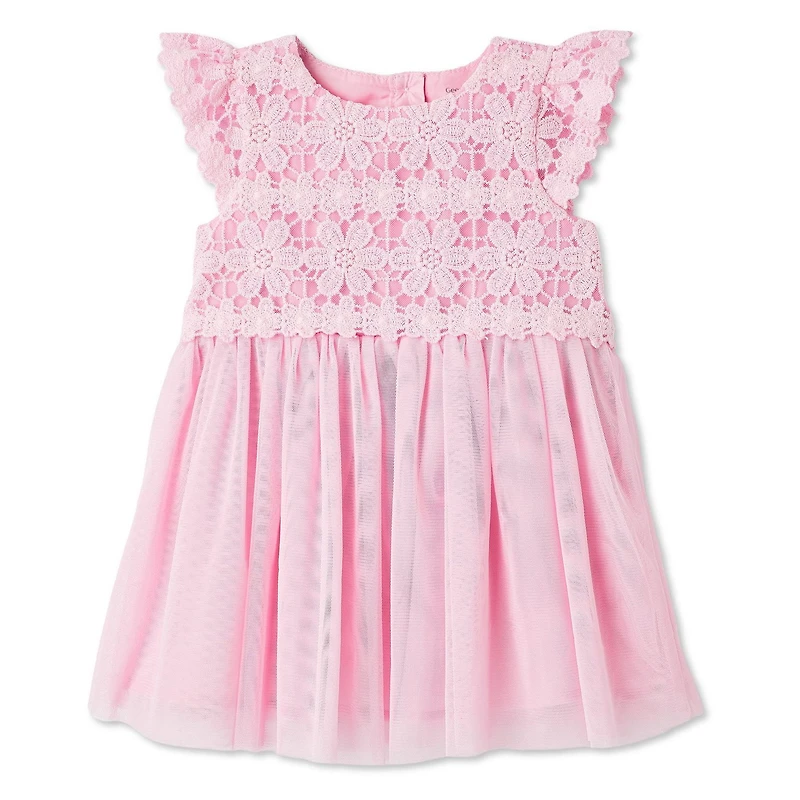 Make every moment picture-perfect with George baby girls' lace dress. Designed with an embroidered bodice and mesh skirt overlay, it brings soft texture and classic charm to her special-day wardrobe. The cap sleeves, gathered waist, and back button placket add thoughtful details, while the inner lining keeps her comfy underneath. Whether it’s for family photos or a festive occasion, this dress is made to stand out.