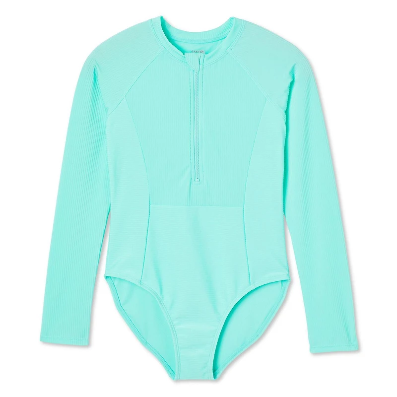 Keep her safe and protected from the sun's rays with George girls' rash guard 1-piece. Made of tricot knit and lined for comfort, it'll be cool and comfy for the beach or pool. The rash guard is designed with a crew neckline, long raglan sleeves, a half-zip closure, and princess seams. It's finished with elasticized legholes for a secure fit. Complete the look with her favourite pair of sandals.