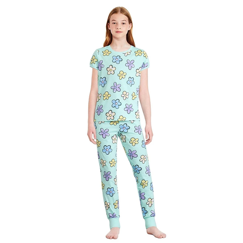 Soft, cozy, and made for sweet dreams, George girls’ two piece pajama set is a bedtime essential. Crafted from slub jersey knit, it keeps her comfy through the night. The top features a crew neck, short sleeves, and banded cuffs, while the matching joggers include an elasticized waistband, fitted cuffs, and an all-over print for a coordinated ensemble. Finish the look with fuzzy socks for extra warmth.
