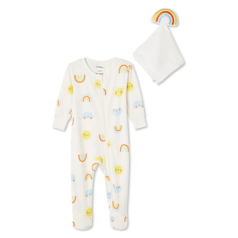 George infants' gender inclusive sleeper 2-piece set is perfect for bedtime. Made from velour knit, it's soft and cozy for bedtime or playtime. The sleeper features a crew neckline, long sleeves, a convenient full-zip closure, an all-over print, fitted cuffs, and attached footlets with grippers to keep little feet warm and secure. Plus, it includes a plush toy for extra fun. Get ready for snuggles and smiles.