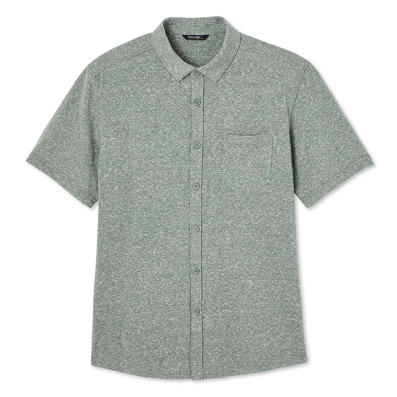 Step up your style game with the smart and sophisticated George men's knit shirt. Made of slub jersey knit, it’s perfect for wearing to the office or dressing up for special occasions. The shirt features a pointed collar, short sleeves, and a full-button closure. It’s designed with an all-over speckled pattern and a chest patch pocket. Finished with a curved hem, this shirt is easy to pair with jeans for a laid-back yet put-together look.