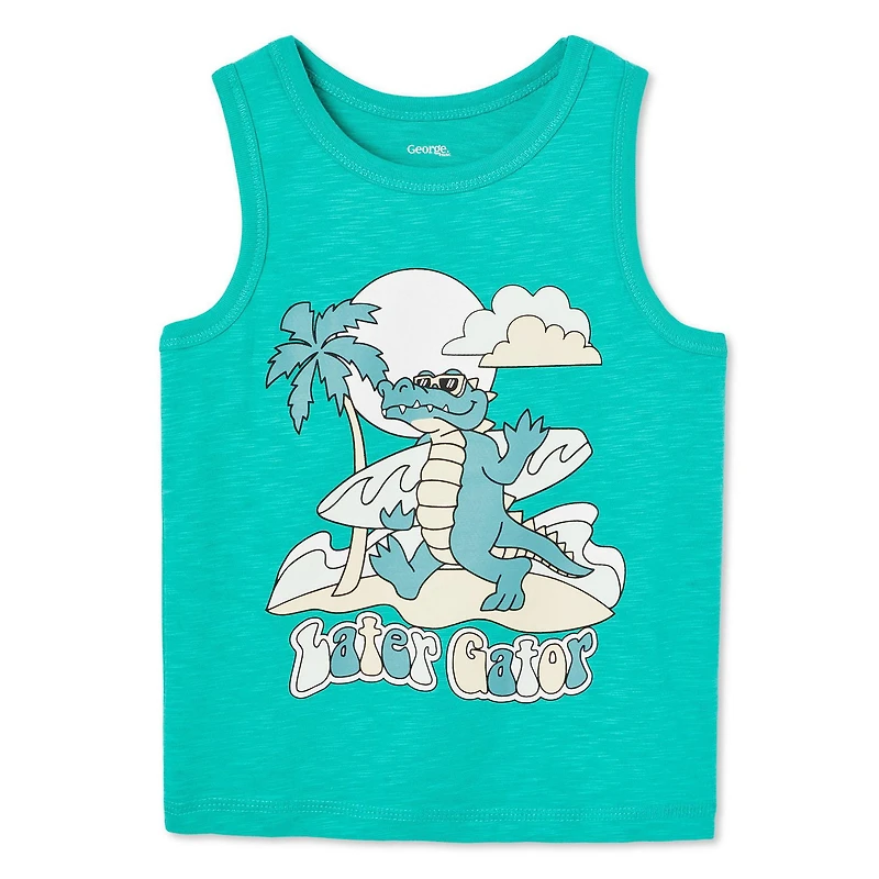 He’ll be ready for a day of play with George toddler boys' graphic tank. Composed of slub jersey knit in 100% cotton, it keeps him cool and comfy whether he’s at daycare, running around the playground, or lounging around at home. The tank features a classic crew neckline, a sleeveless design, and a front graphic print. Finished with a straight hem, it’s easy to pair with a variety of bottoms like shorts, jeans, or joggers.