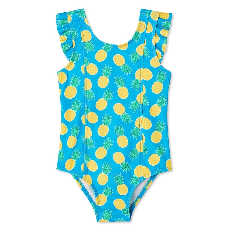Add the adorable and practical George toddler girls' adaptive swimsuit 1-piece to her swim collection. Made of tricot knit with a pique jersey lining, it'll be comfy when she's in and out of the water. Featuring a round neckline, ruffled straps, Velcro closures for easy dressing and undressing, a front insert for abdominal access, a back cut-out, elasticized legholes, and an all-over print, it's perfect for fun days at the pool or beach.