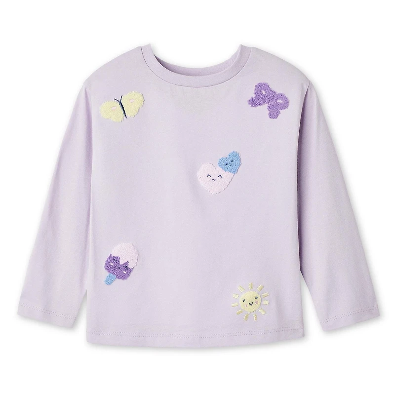 George toddler girls’ long-sleeve graphic T-shirt brings a soft, playful touch to her everyday outfits. Made of jersey knit, it keeps things light and comfy for all-day wear. The crew neck, long sleeves, and straight hem create an easy, classic fit, while the front and back graphics add those cute, textured details that’ll stand out in her closet. Pair it with leggings, joggers, or denim for a cheerful look.